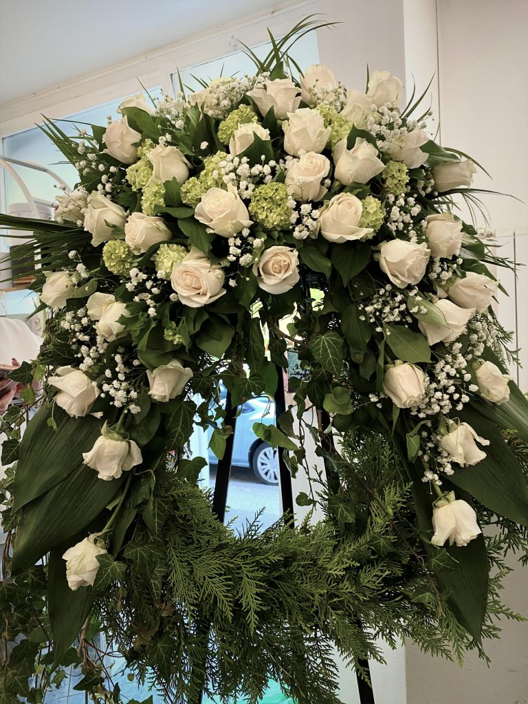 aranžiran od četrdesetak bijelih ruža, na zelenoj podlozi, sa dodanim detaljima bijelog sitnog cvijeća i pažljivo odabranog zelenila.