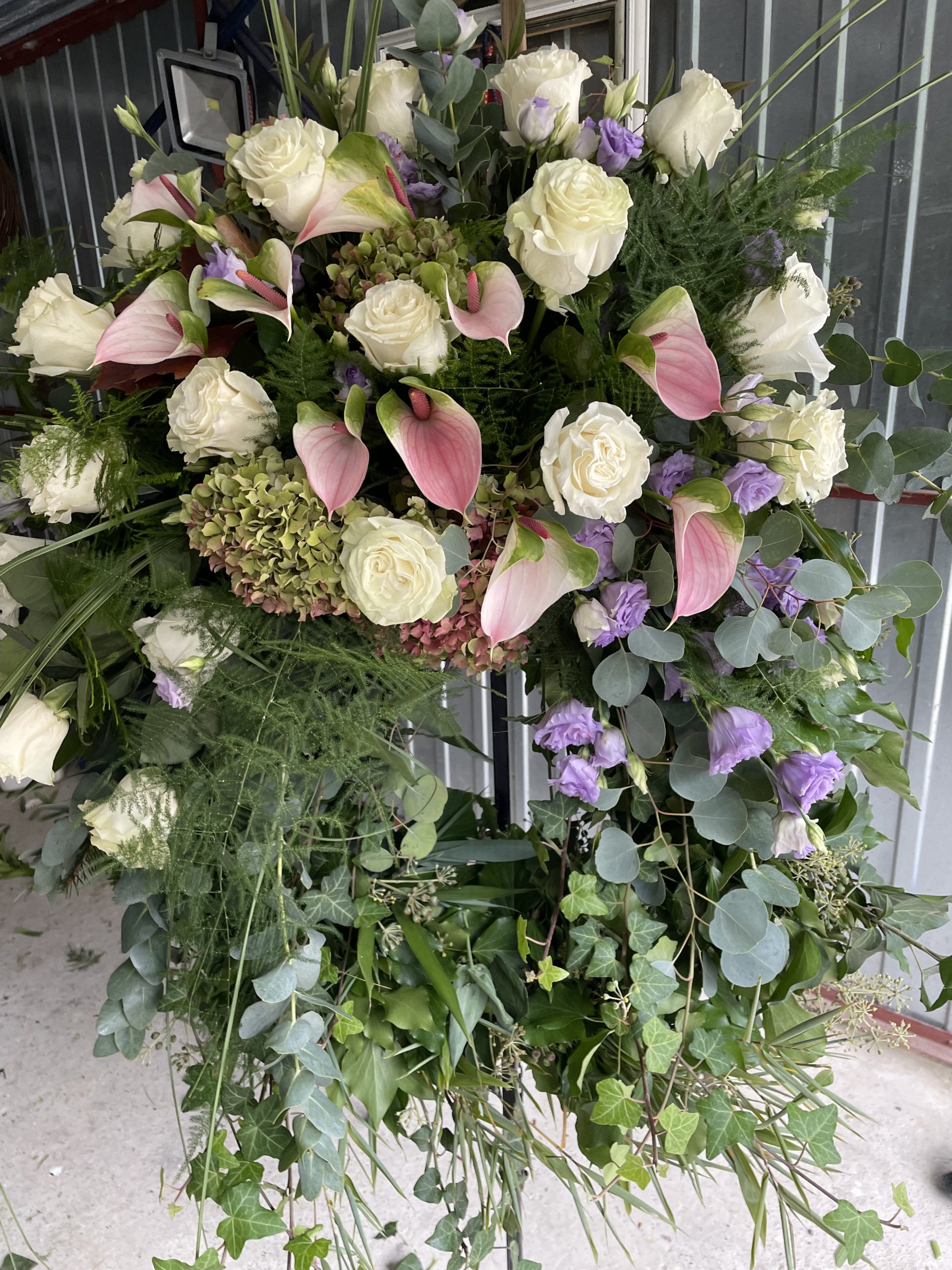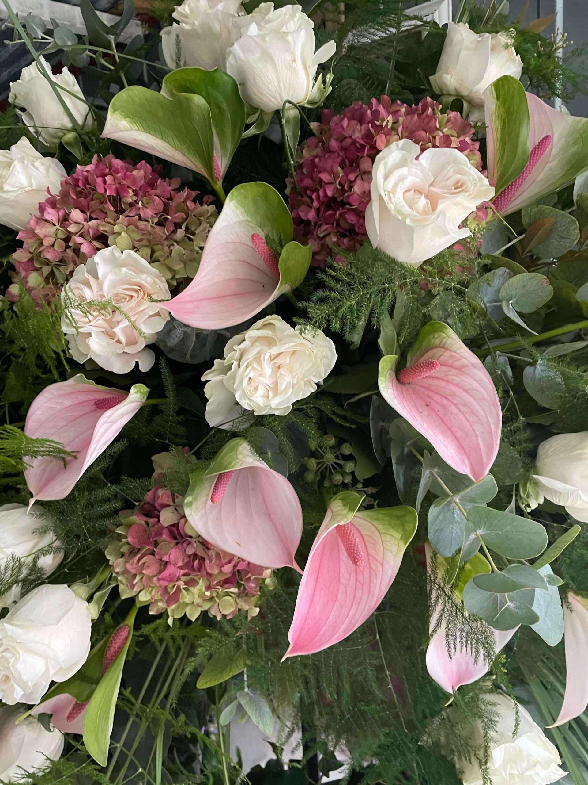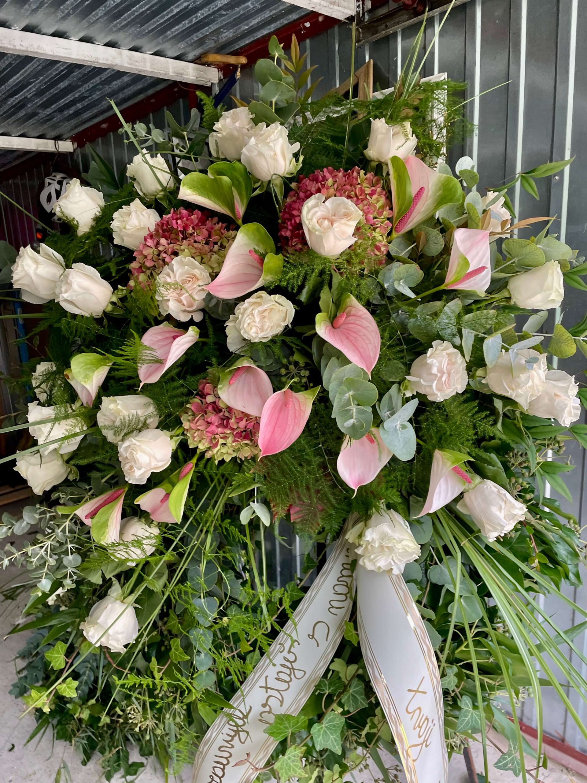 Vijenac Duje, namijenjen za ispraćaj, bilo da se radi o bližoj obitelji, ili pak od prijatelja i rodbine. Nježni tonovi anturiuma, centar su ove cvjetne dekoracije.