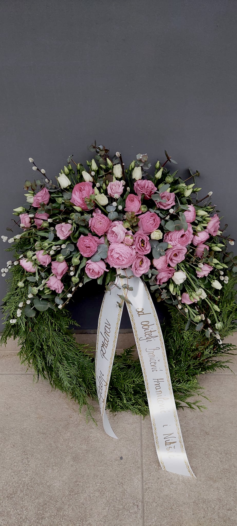 Vijenac Florijan, cvjetna je dekoracija prigodna za ispraćaj, u tonu zagasito roze.
