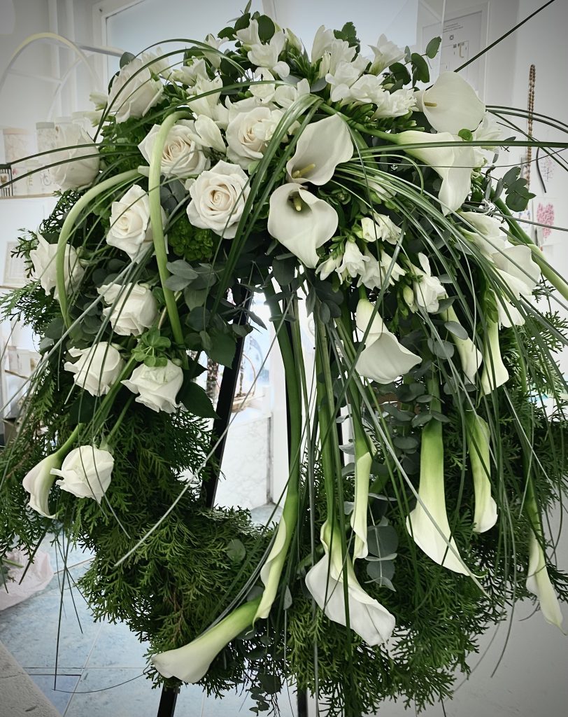 Vijenac Kale, elegantan, profinjen i svečani vijenac, prigodan za ispraćaj, aranžiran od kala, ruža i frezija.