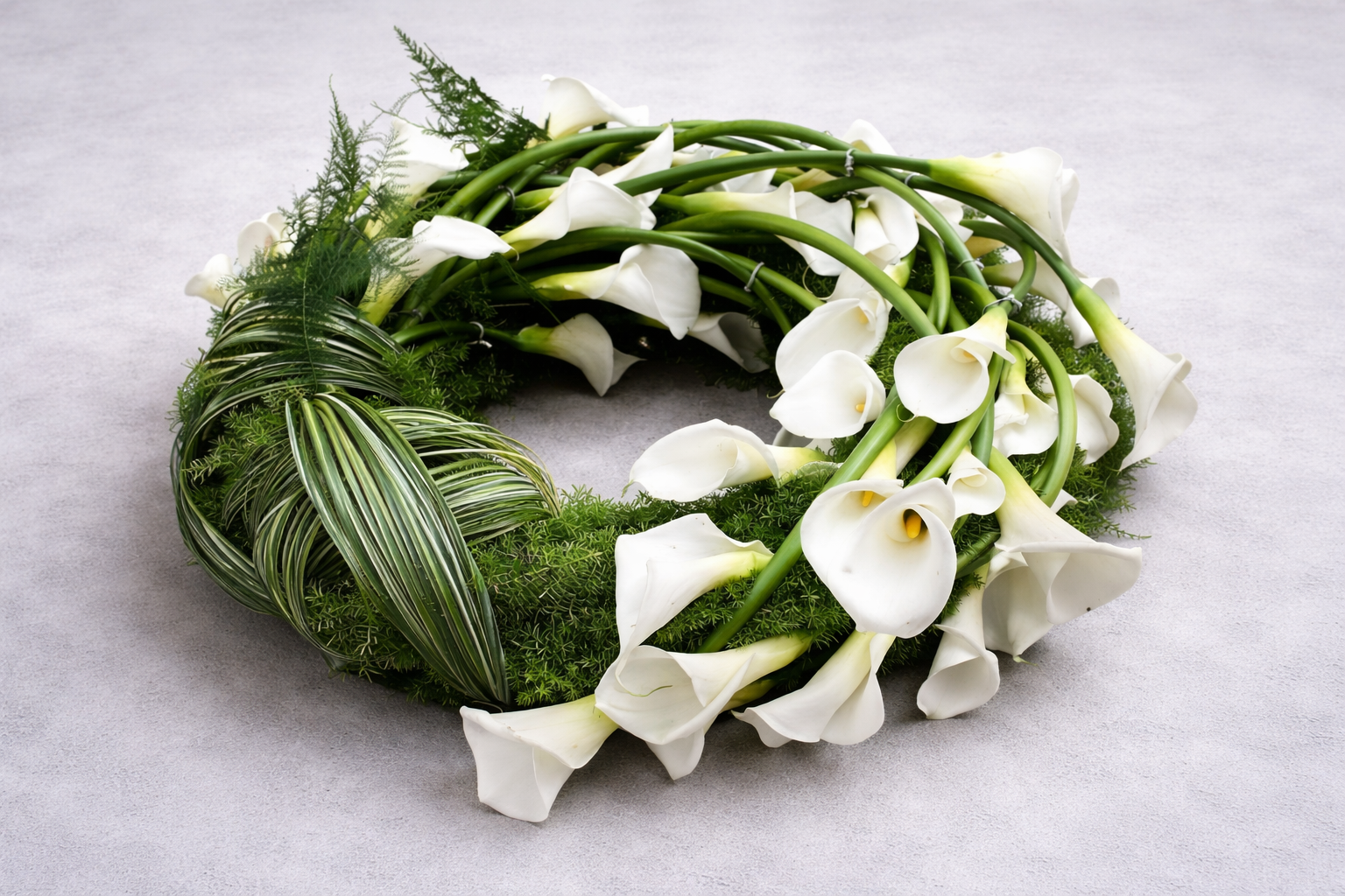 Vijenac mak, svojim kontrastom zelene i bijele, izražava profinjenun i nježnu sućut i poštovanje.