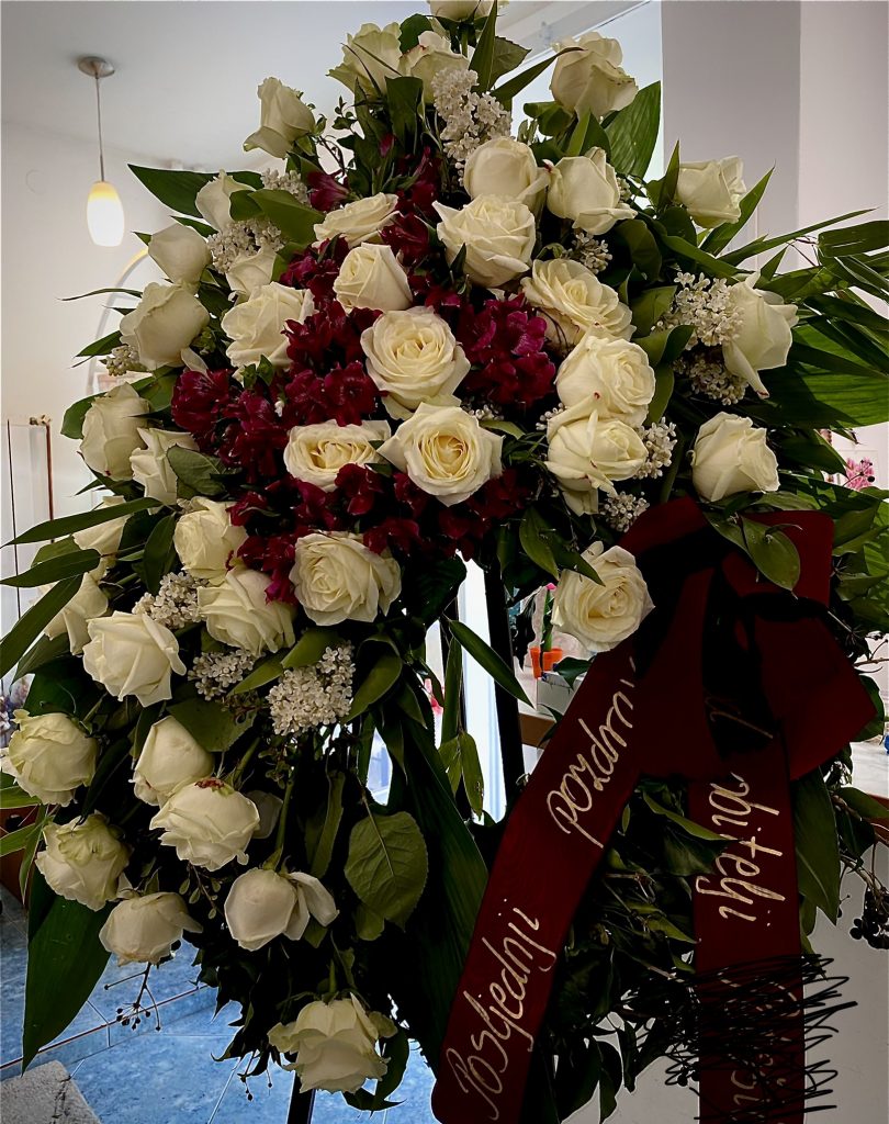 Vijenac Ruža, prigodan za pogreb. Na zelenoj osnovi aranžirano četrdeset bijelih ruža i alstromwrija u cikalma boji.