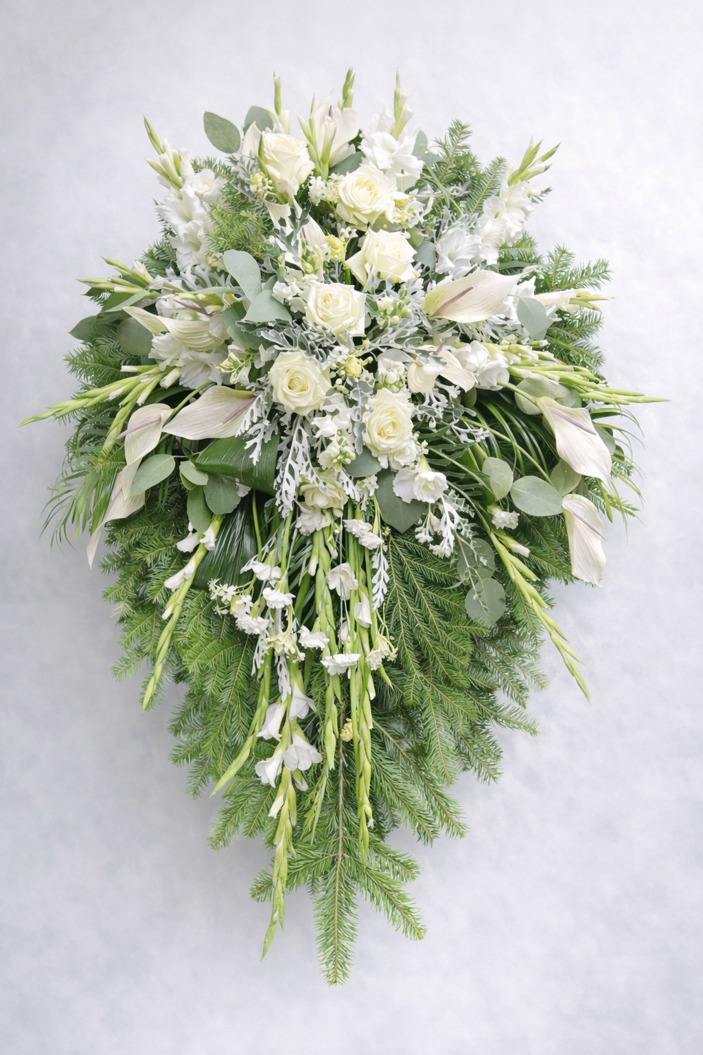 Elegantni vijenac u nježnim bijelim tonovima, izrađen od ruža, kala i sezonskog zelenila. Pročišćenog i smirenog izgleda, simbolizira mir, tišinu i vječnost. Prikladan za dostojanstven oproštaj i izražavanje poštovanja.