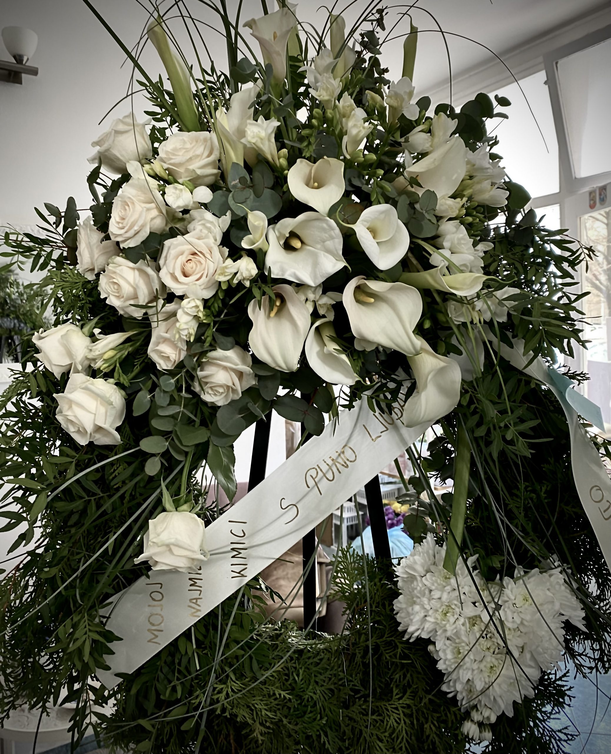 Vijenac Zvonimir, elegantna i profinjena cvjetna je dekoracija pažljivo odabranog cvijeća u bijelom tonu.